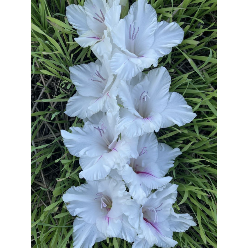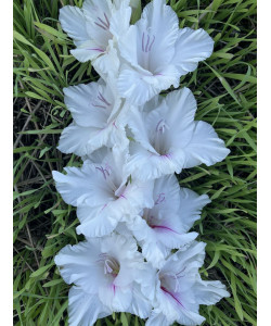 Огромные, сияющие белые цветы, от центра на трех нижних лепестках образуются лучеобразные пурпурные пятна. Цветы сильно гофрированные, собранные в мощный и прочный колос. Здоровый, быстро растущий сорт